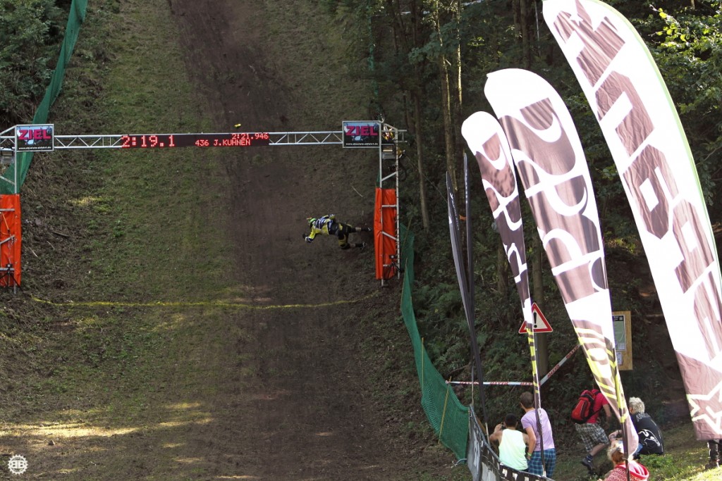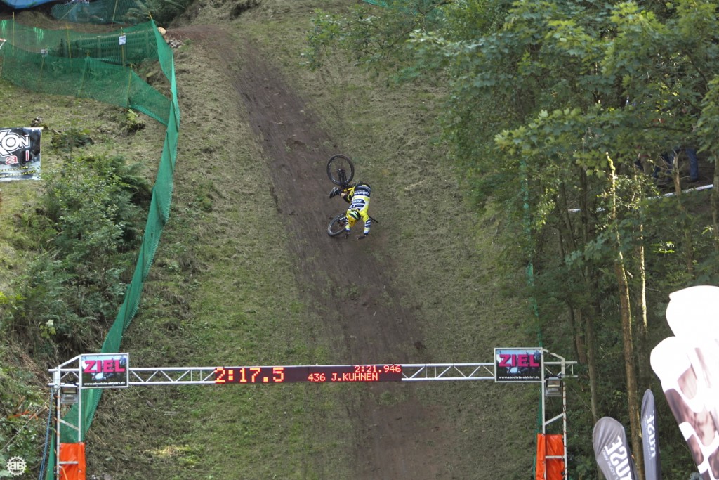 Samstag, 14 Uhr. Der Seeding Run geht los. Jason steht am Start und man merkt bei ihm wieder, dass ihn das rote Licht nur in der Box festhält und er endlich los will. Das Horn erklingt, das Licht wechselt und er legt los. Er legt eine super Abfahrt hin, nimmt alle Hindernisse wie geplant und fährt sauber seine Linie. Am Ziel schlägt dann das zweite Mal das Schicksal zu und er trifft ausgerechnet den Zielsprung ungünstig und stürzt quasi ins Ziel.