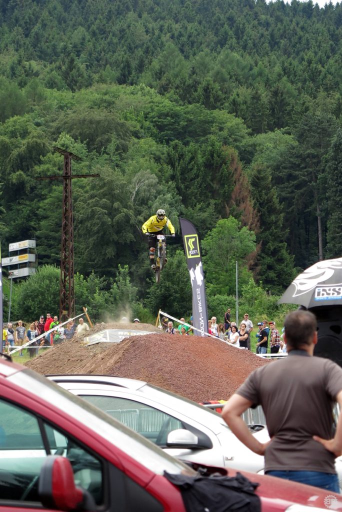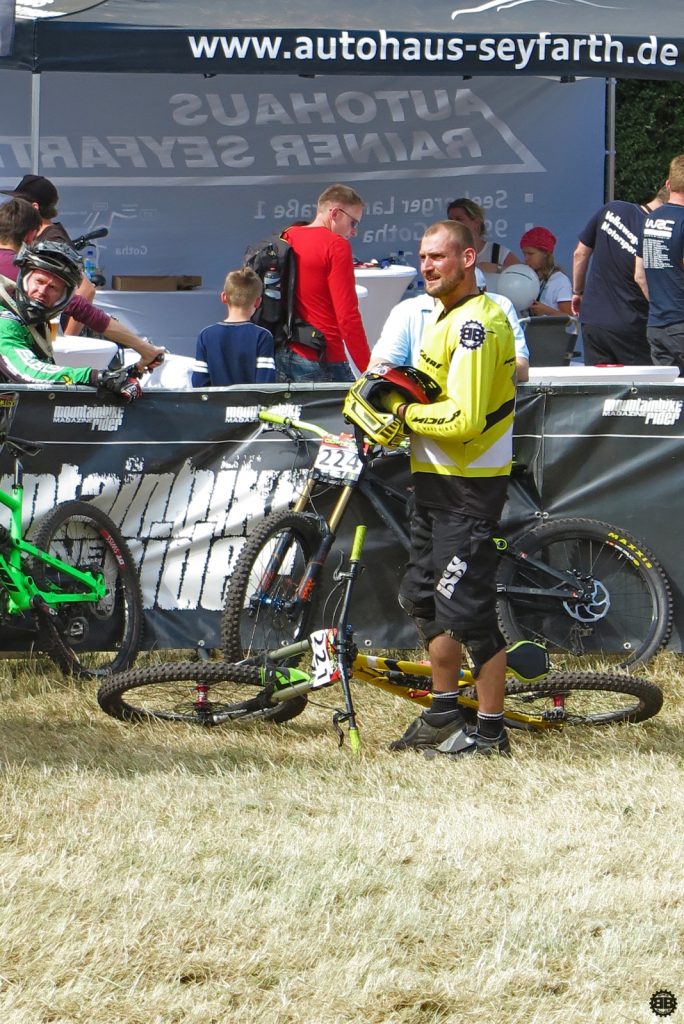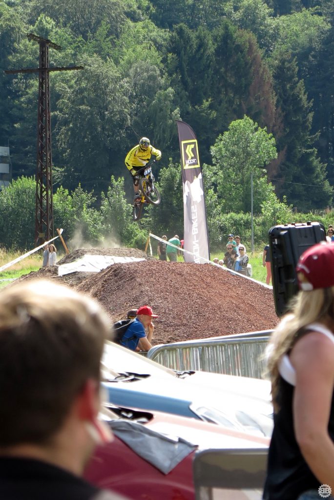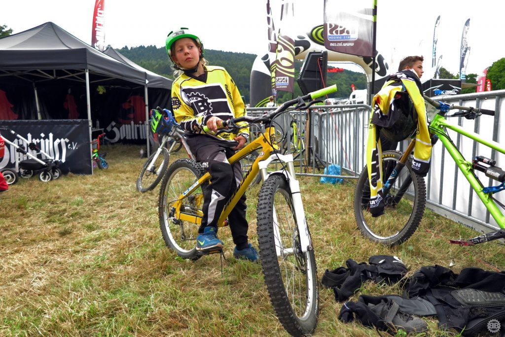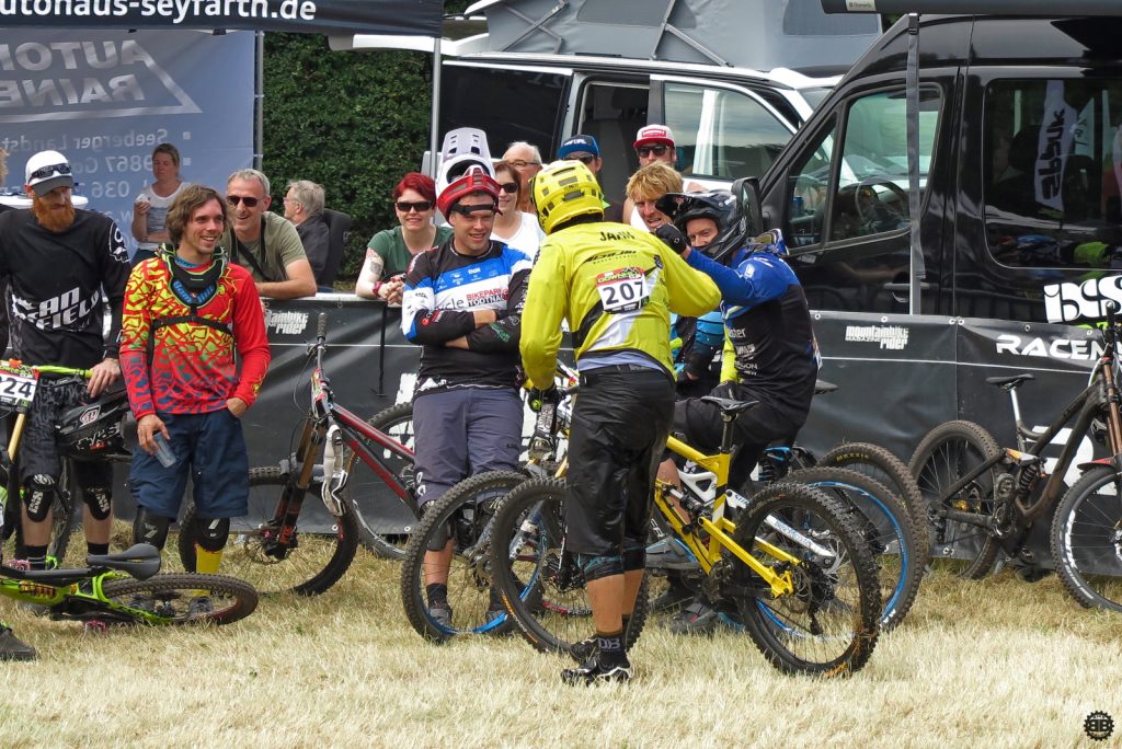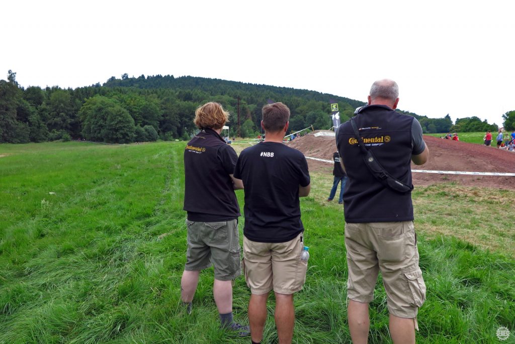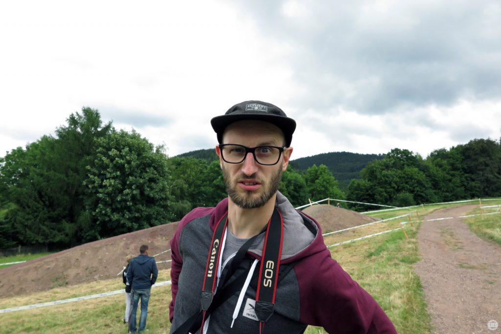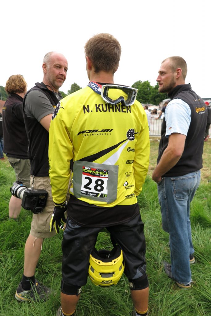 Francois Manzella, der bei Nicolai ein sechsmonatiges Betriebspraktikum absolviert und von Daniel fast mütterlich betreut wird, ist mittlerweile guter Freund des NBB-Teams und stolzer BikeBauer-Ambassador-Fahrer. Frisch in sein BikeBauer-Trikot gehüllt, gebührt es ihm, den ersten Starter des Teams an diesem Sonntag zu stellen. Ich begleite ihn zum Start und quatsche ihn solange voll, bis seine doch aufkeimende Nervosität angesichts seines ersten deutschen Downhill-Rennens etwas nachlässt. Mit einem aufrichtigen „Bonne Chance“ entlasse ich ihn zum Start und quatsche auf dem Weg an der Strecke lang noch mit Tante Rödl und Jason, die benfalls auf ihren Start warten, bis der Franzose an uns vorbeifliegt und wir ihn lauthals brüllend den Berg hinab schicken.