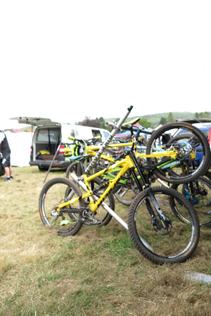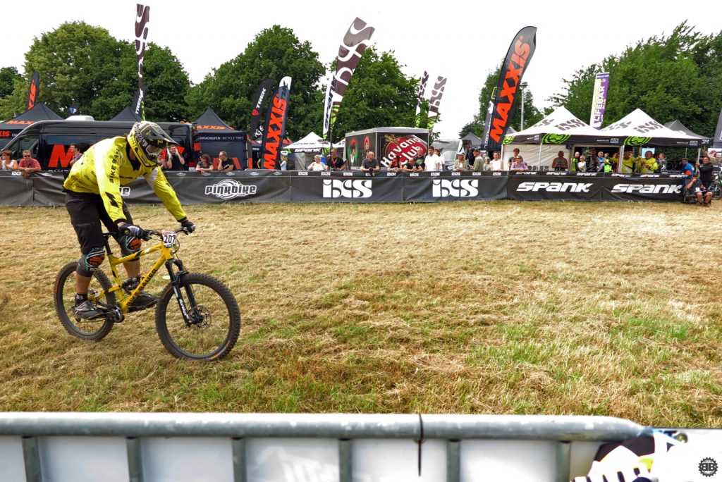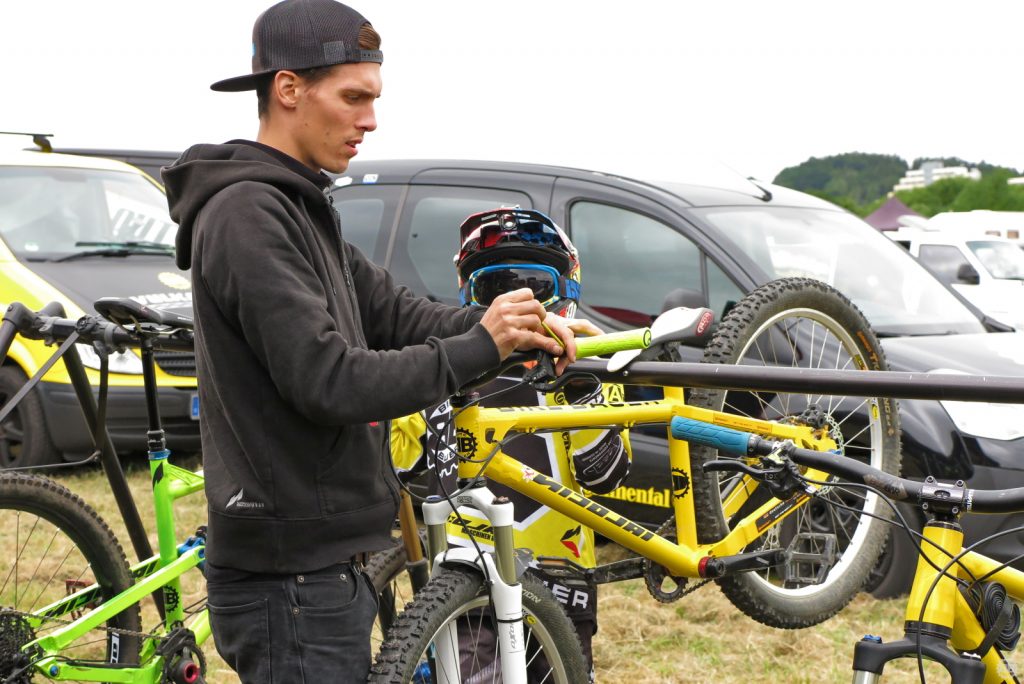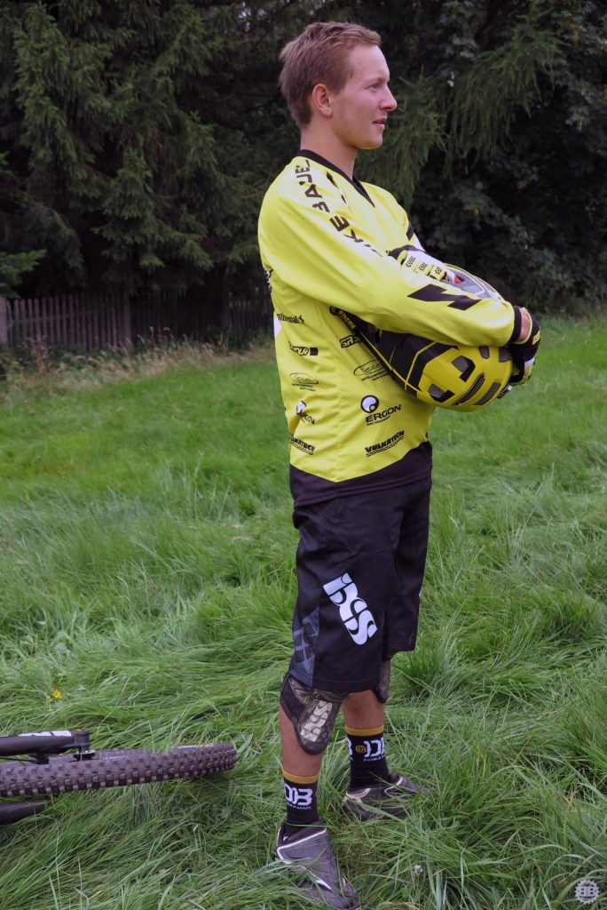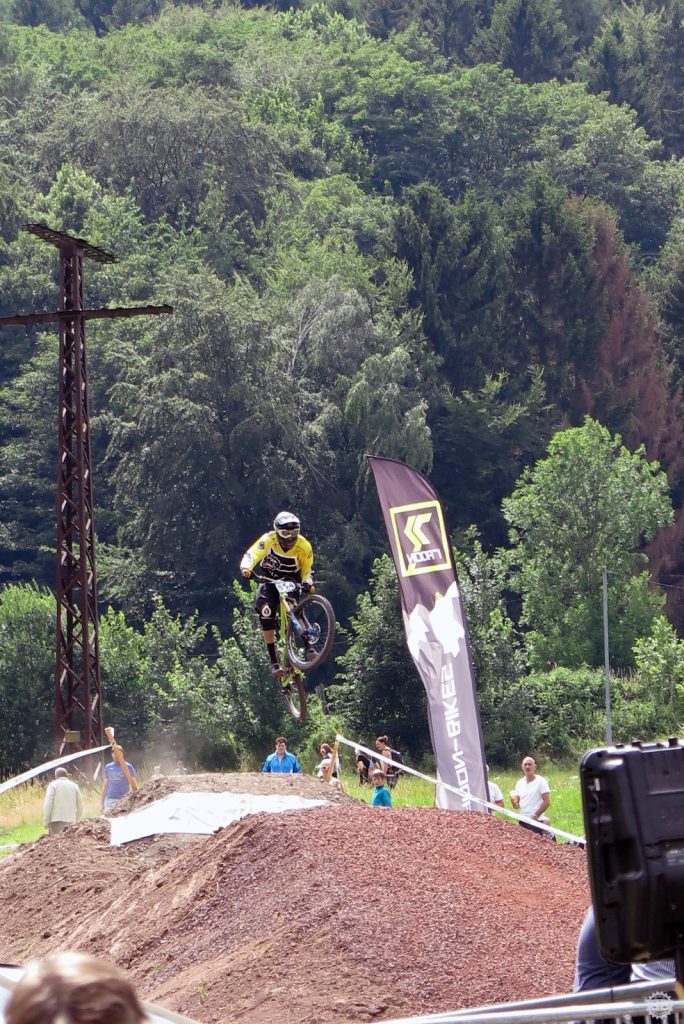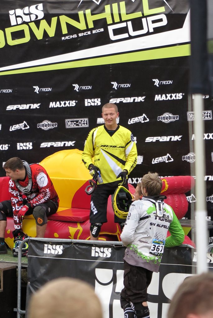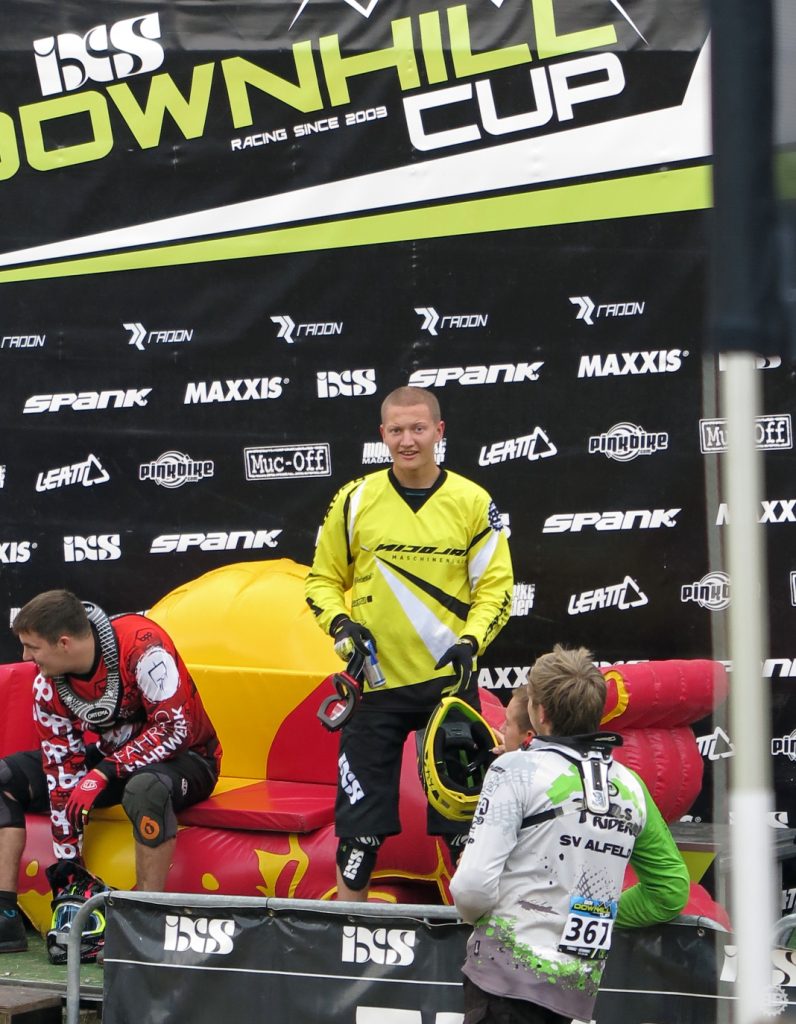Francois Manzella, der bei Nicolai ein sechsmonatiges Betriebspraktikum absolviert und von Daniel fast mütterlich betreut wird, ist mittlerweile guter Freund des NBB-Teams und stolzer BikeBauer-Ambassador-Fahrer. Frisch in sein BikeBauer-Trikot gehüllt, gebührt es ihm, den ersten Starter des Teams an diesem Sonntag zu stellen. Ich begleite ihn zum Start und quatsche ihn solange voll, bis seine doch aufkeimende Nervosität angesichts seines ersten deutschen Downhill-Rennens etwas nachlässt. Mit einem aufrichtigen „Bonne Chance“ entlasse ich ihn zum Start und quatsche auf dem Weg an der Strecke lang noch mit Tante Rödl und Jason, die benfalls auf ihren Start warten, bis der Franzose an uns vorbeifliegt und wir ihn lauthals brüllend den Berg hinab schicken.