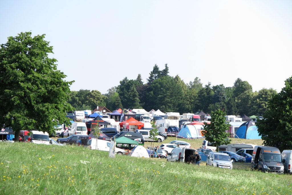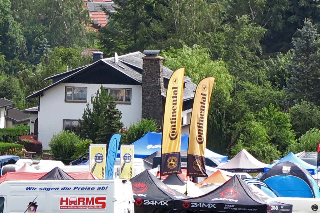 Freitags abends schlendere ich noch ein wenig über das Gelände und schaue mir an, was die Veranstalter so aufgefahren haben. Mit dem feinen Angebot an Gegrilltem, Gebackenem und Gezapftem sollte da keinem etwas fehlen. Unser Conti-Zelt thront zentral auf der Rasenfläche, die Fahnen flattern im kühlen Wind und ziehen mich dann doch wieder zurück zum Team.