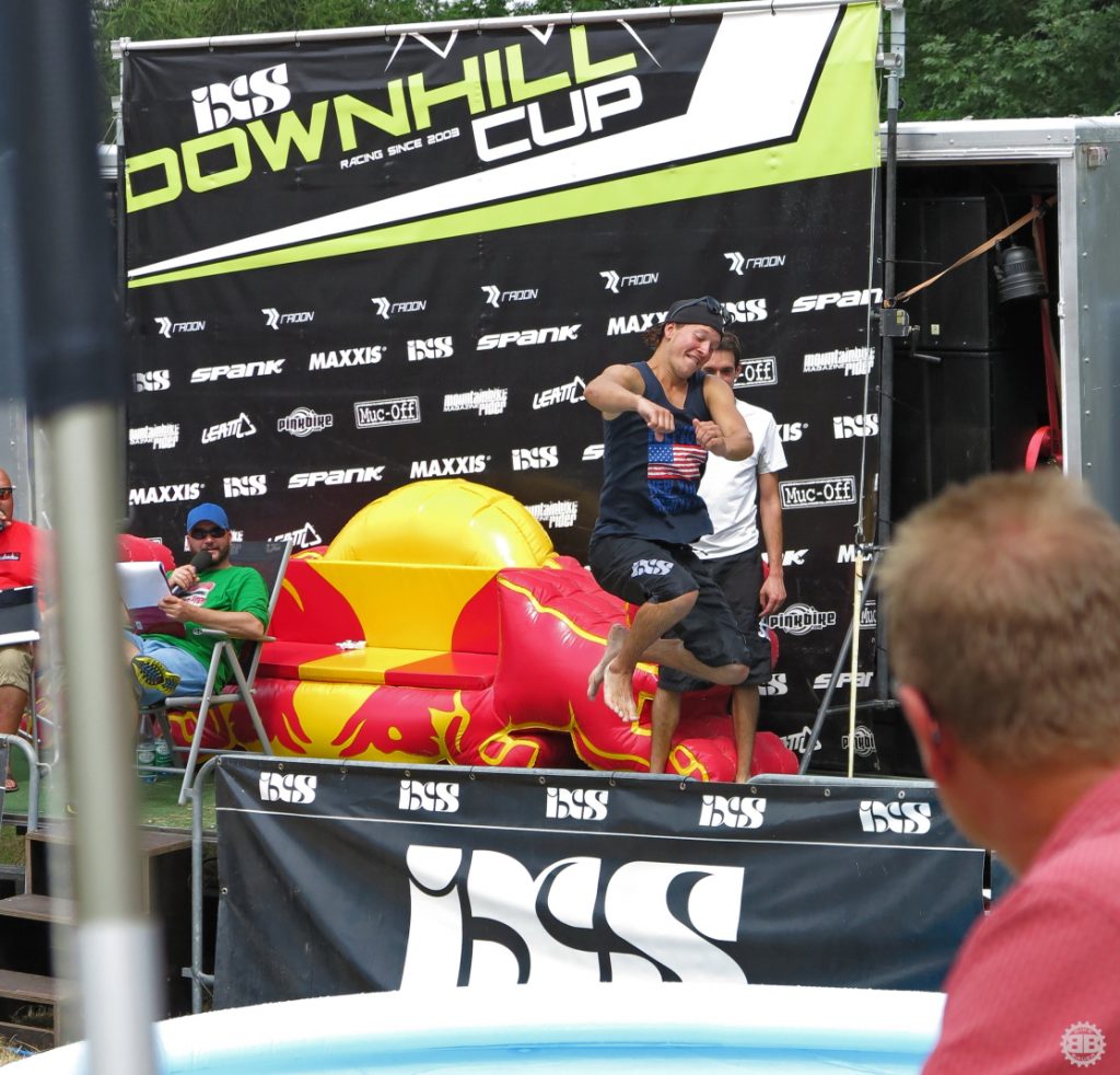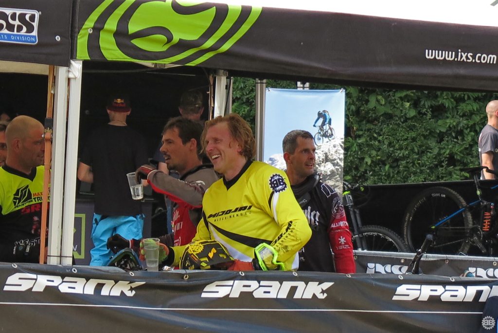 Die Gespräche ziehen sich bis in die Dunkelheit und so langsam erwachen auch die Partywütigen unten am IXS-Stand. Der Zieleinlauf wurde zur Tanzfläche umgebaut und es zieht nicht wenige Racer und Einheimische zum satten Bass und den kühlen Getränken. Torsten und ich schlendern noch kurz vorbei und treffen Hermes Schade, der sichtlich in den Partymodus umgeschaltet hat und ganz klar auf der Suche nach Entertainment ist. Frotzeleien gehen hin und her, die Stimmung steigt und die Downhillparty nimmt ihren gewohnten Lauf mit ausgelassenen Gästen und dem typisch wirren Musikmix aus Metal, HipHop und Schlagern.