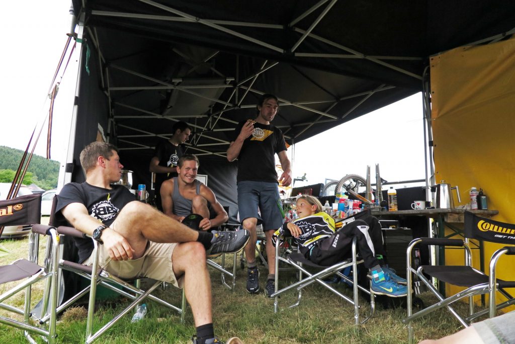 Beim gemütlichen Austausch über vergangene Rennen und die neuesten kleinen und größeren Missgeschicke abseits der Rennstrecken legt sich die Sonne hinter die urigen Höhen des Thüringer Waldes. Zügig wird es kühl und einer nach dem anderen fällt gesättigt und mit Spannung auf den Seedingrun in den Schlafsack im Teamzelt und genießt die frische Luft beim einschlafen.