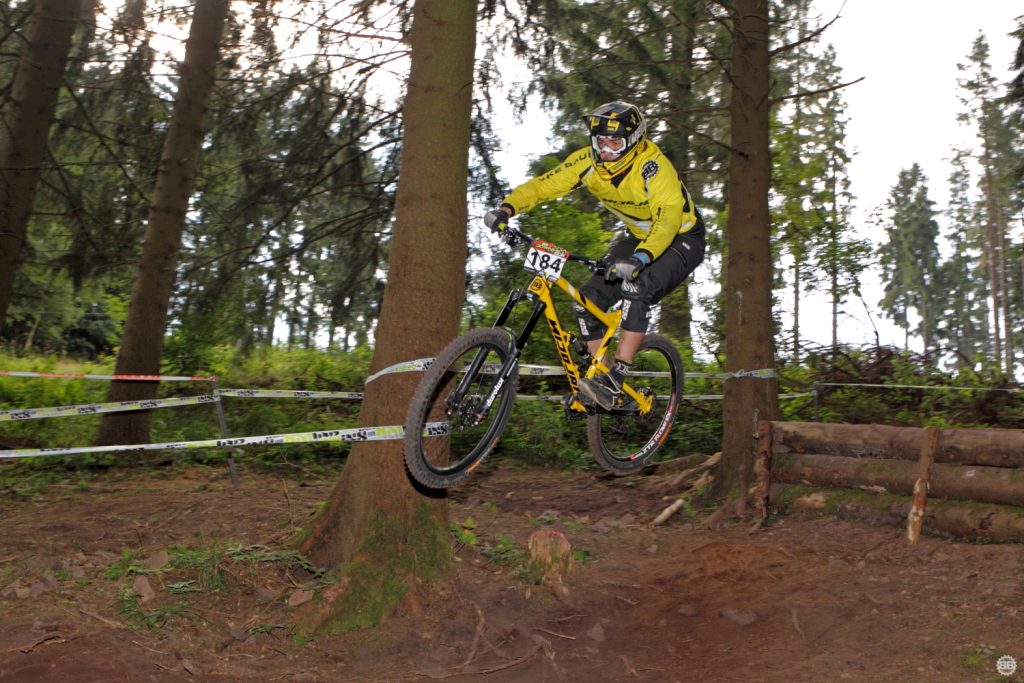Bei mir stellt sich zum ersten Mal ein Gefühl ein, was in Winterberg beim Rennen irgendwie nicht kommen wollte: ich habe Spaß am ballern, Spaß mit den anderen Fahrern und an der geilen Strecke. Aber, nach dem Höhenflug kommt ja bekanntlich…richtig, der Absturz. Letzte Abfahrt: eine Kurve zu spitz angefahren, das Hinterrad rutscht weg und mein Daumenballen landet beim Abfangen des Sturzes genau auf einem spitzen Stein. Scheisse! Es tut höllisch weh, scheint aber nicht gebrochen und außerdem stehe ich mitten im Wald kurz vor den Steilkurven. Also wieder rauf auf den Hobel.