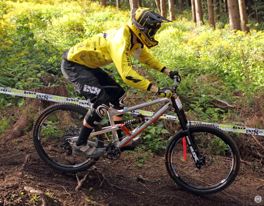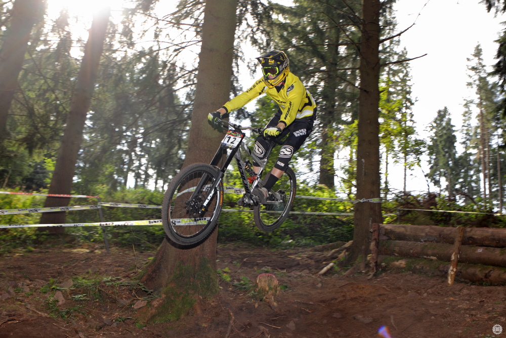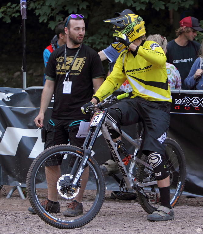 Nach dem ersten Run wartete Thomas bereits aufgeregt im Ziel, um zu sehen, wie mir das Rad taugt. Ich war begeistert und entschied mich, dass Rennwochenende mit dem G19 zu bestreiten. Also habe ich auf vier weiteren Runs das Bike auf Herz und Nieren getestet und bin gleich im zweiten Lauf auch das ominöse Holzkreuz gesprungen. Durch den deutlich flacheren Lenkwinkel im Vergleich zu meinem 20er musste man die Körperposition weit in Richtung Vorderrad bringen. Da ich bereits mein Endurorad mit Geometron Winkeln fahre, gelang es mir, mich relativ kurzfristig umzugewöhnen.