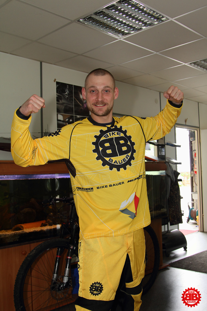 Hallo, die neue Arbeitskleidung für die BikeBauer-Crew ist eingetroffen – designed im eigenen Hause by Johannes! Leider haben die Hosen keine Taschen, sonst sind wir aber super zufrieden! Ralf & Tanja